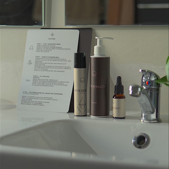 Voor mannen met een baard is er ook het Men's Daily Ritual + Beard Oil — dezelfde drie producten, aangevuld met onze Beard Oil op basis van biologische hennepzaadolie met CBD.