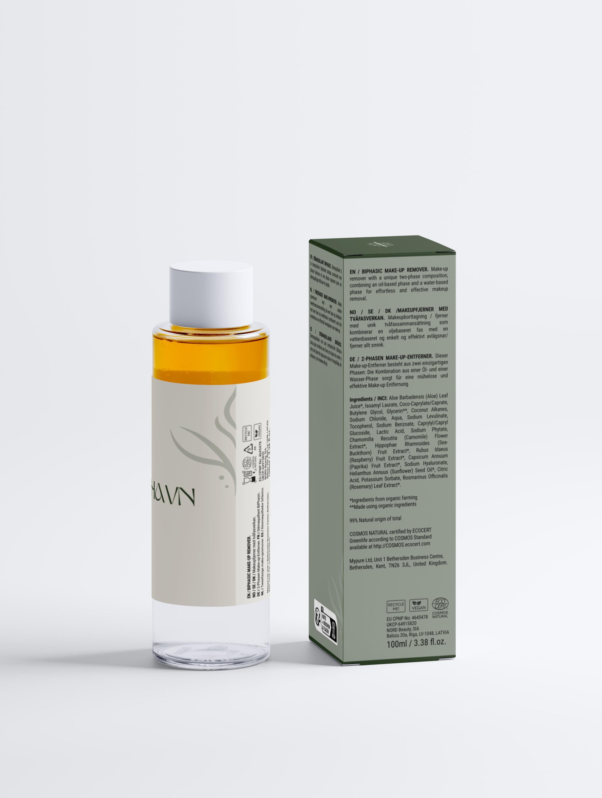 Een tweefasen, parfumvrije formule op basis van biologische aloë vera. Verwijdert make-up, SPF en dagelijkse onzuiverheden van gezicht én ogen zonder de huidbarrière te verstoren. Met kamille, duindoorn en hyaluronzuur. 99% natuurlijke ingrediënten.